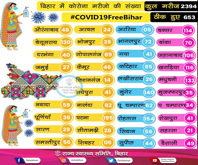 जारी किया गया है. इस आकंड़े के मुताबिक राज्य के विभिन्न जिलों से कुल 49 नए मरीज सामने आये हैं. इसके साथ ही बिहार में आंकड़ा बढ़कर 2394 हो गया है.स्वास्थ्य विभाग की ओर से जारी ताजा आंकड़े के मुताबिक सीतामढ़ी से 13, पश्चिमी चंपारण से 2, नवादा से 6, औरंगाबाद से 12, नालंदा से एक, भागलपुर से 2, गया से 8, वैशाली से एक और सारण से 4 मामले पॉजिटिव आये हैं.
