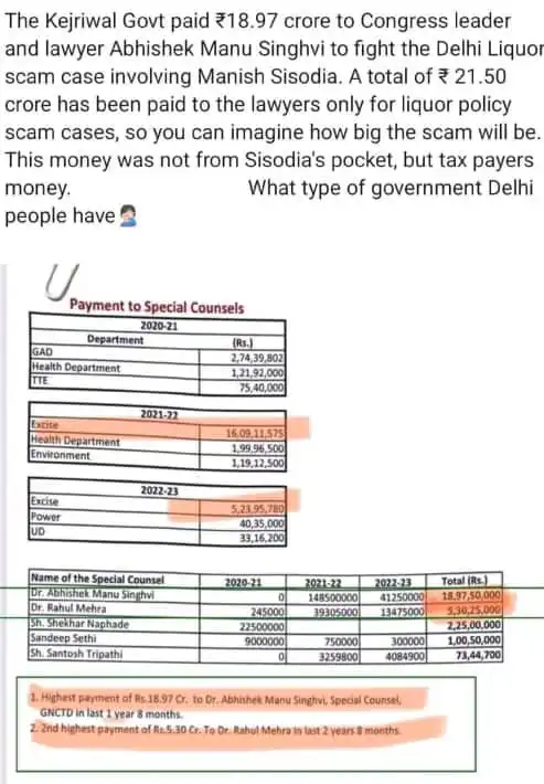 अरविंद केजरीवाल ने कांग्रेस नेता और वकील अभिषेक मनु सिंघवी को दो दिल्ली शराब घोटाल मामले में अपनी तरफ से केस लड़ने के लिए अब तक दो बार भुगतान किया है। एक बार 14 करोड़ 85 लाख और दूसरी बार करोड़ 12 लाख 50 हजार। इसके अलावा दिल्ली हाईकोर्ट में दिल्ली सरकार की तरफ से केस लड़ने के लिए डॉ राहुल मेहरा को तीन बार भुगतान किया है। पहली बार में 24 लाख 5 हजार, दूसरी बार 3 करोड़ 93 लाख 5 हजार और तीसरी बार 1 करोड़ 37 लाख 75 हजार, जो कुल मिलाकर 5 करोड़ 30 लाख 25 हजार होता है।