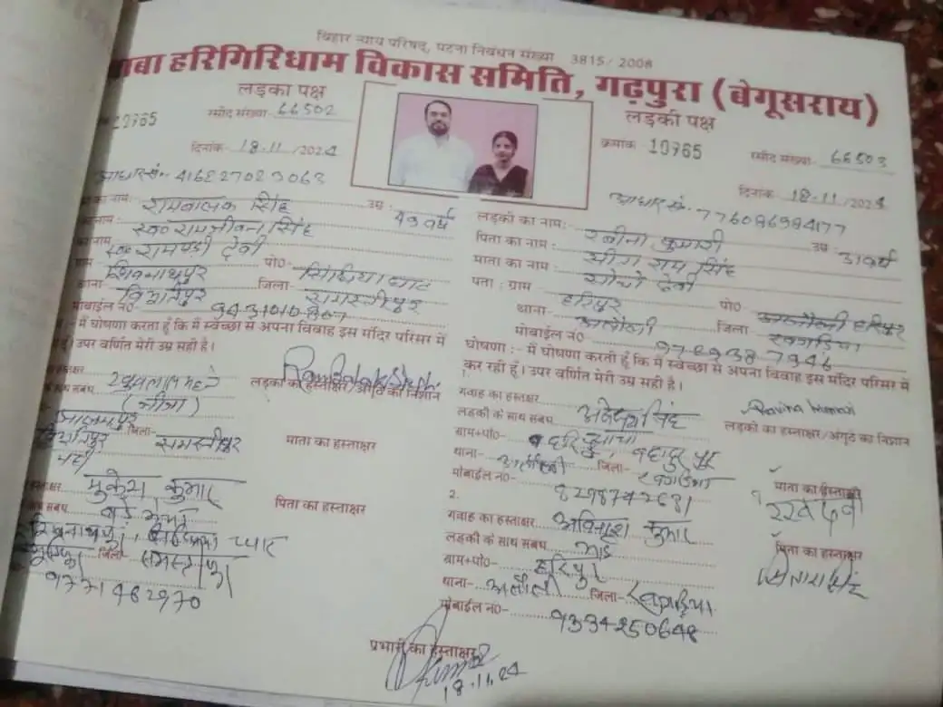 हरिगिरि धाम कार्यालय के रजिस्टर तथा रसीद पर लड़का और लड़की के माता-पिता के भी हस्ताक्षर होते हैं। इसमें रसीद और रजिस्टर पर पूर्व विधायक राम बालक सिंह के गवाह के रूप में उनके बड़े भाई मुकेश कुमार का हस्ताक्षर हैं, जबकि दुल्हन रबीना कुमारी की ओर से रसीद और रजिस्टर पर उनकी माता रेखा देवी, पिता सीताराम सिंह तथा गवाह के रूप में चाचा अवधेश सिंह एवं भाई अविनाश कुमार के हस्ताक्षर हैं।