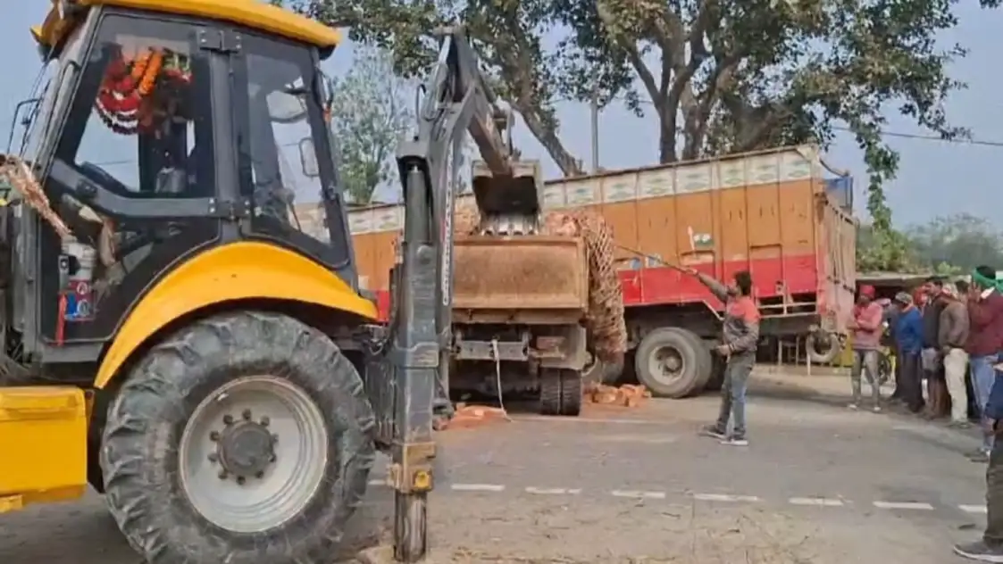दो ट्रकों की आमने-सामने की भयानक भिड़ंत में एक चालक की मौत, दूसरा फरार; JCB से हटाया गया मलबा..