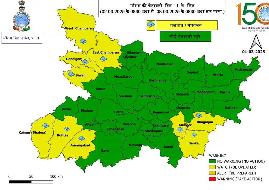 बिहार के पश्चिम चंपारण, पूर्वी चंपारण, गोपालगंज, सिवान , कैमूर, रोहतास, औरंगाबाद, भागलपुर, मुंगेर, बांका जिले में 2 और 3 मार्च को बारिश को लेकर अलर्ट जारी हुआ है. इस दौरान मेघगर्जन और 30 से 40 किलोमीटर की गति से हवा चलेगी. बारिश को लेकर येलो अलर्ट जारी हुआ है. इस दौरान बिहार के विभिन्न शहरों के अधिकतम और न्यूनतम तापमान में दो से चार डिग्री तक कम दर्ज की जा सकती है. विभाग ने अपने पूर्वानुमान में बताया कि मार्च के पहले हफ्ते में अधिकतम तापमान 34 डिग्री तक पहुंच सकता है.