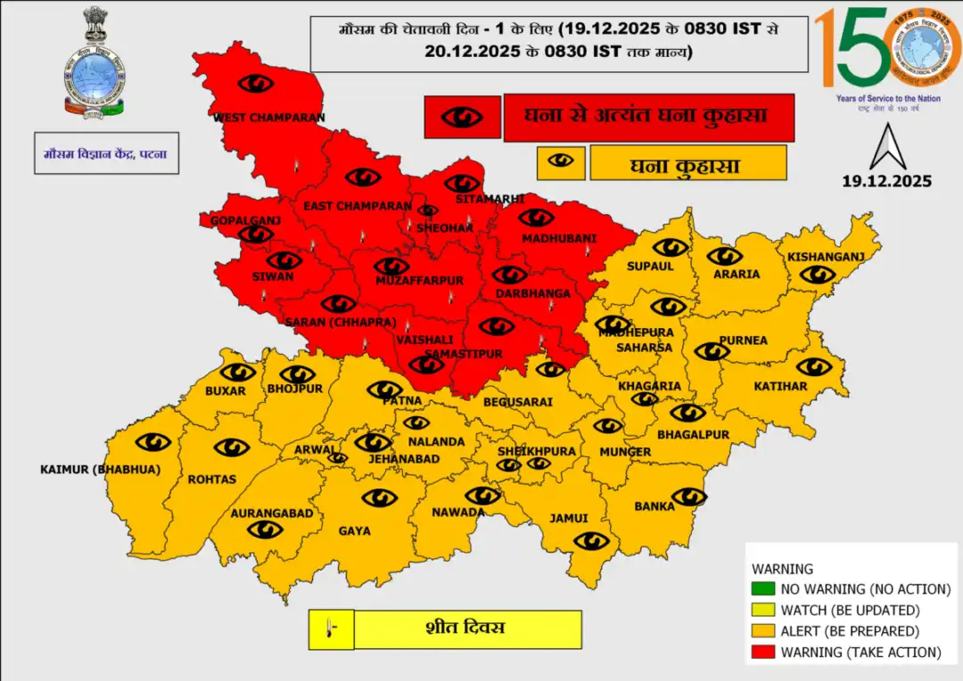 पश्चिम चंपारण, पूर्वी चंपारण, सीतामढ़ी, शिवहर, मधुबनी, दरभंगा, मुजफ्फरपुर, समस्तीपुर, वैशाली, सारण, सिवान और गोपालगंज जैसे जिलों में रेड अलर्ट जारी किया गया है. इन इलाकों में सुबह और रात के समय विजिबिलिटी बहुत कम हो सकती है. ऐसे मौसम में लोगों को बहुत सावधानी बरतने को कहा गया है.