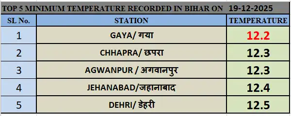 मौसम विभाग के आंकड़ों के अनुसार आज राज्य के कई जिलों में न्यूनतम तापमान काफी नीचे दर्ज किया गया. सबसे कम तापमान गया में 12.2 डिग्री सेल्सियस रहा. इसके बाद छपरा में 12.3 डिग्री, जहानाबाद में 12.4 डिग्री और डेहरी में 12.5 डिग्री सेल्सियस तापमान रिकॉर्ड किया गया.